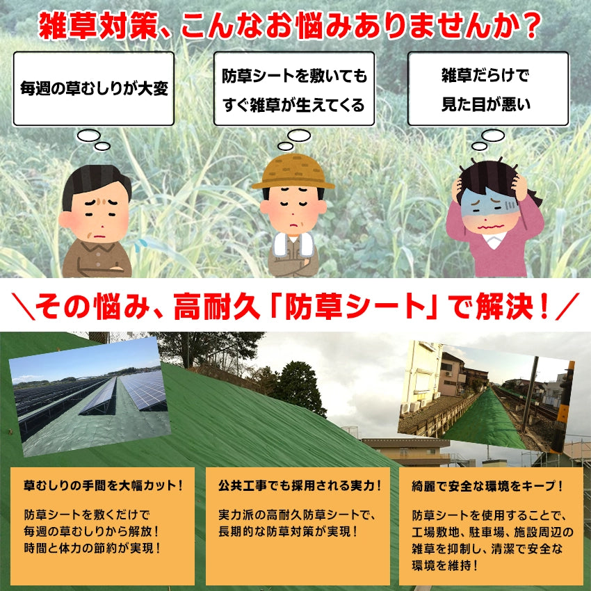 防草シートで草むしりのいらない快適な環境へ!短期用から15~20年といった本格的な長期対策用まで幅広くご用意。ピンやテープなど必要な副資材も全て揃うので、資材を探し回る手間もありません。防草シートを通し、草むしりの手間を省き、美しい環境づくりをサポートします。