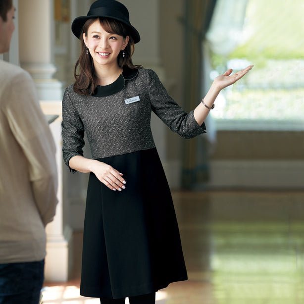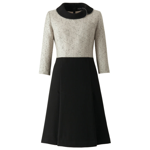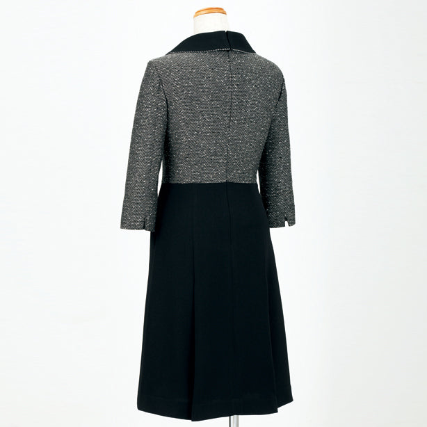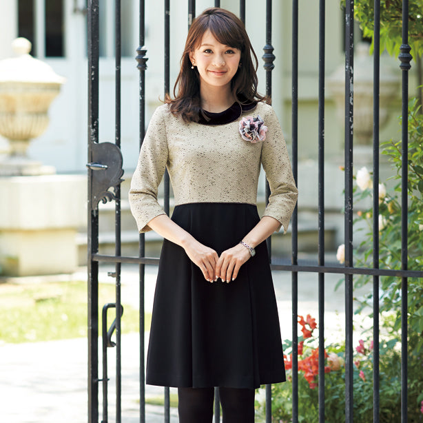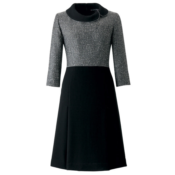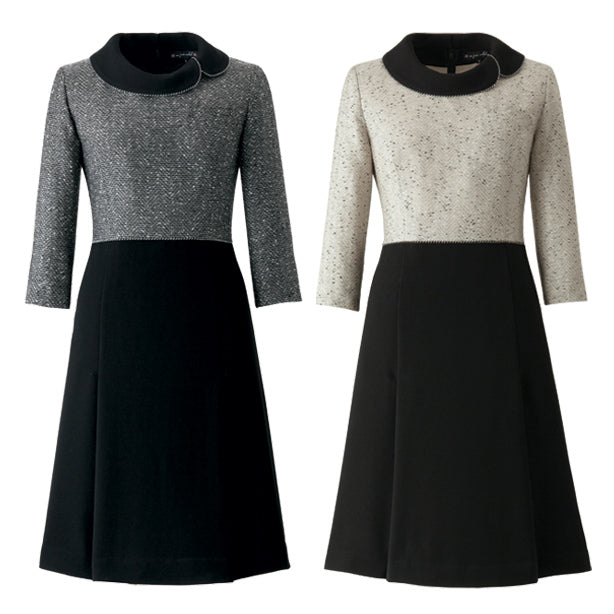 袖口のスリット、ソフトプリーツのスカートがフェミニンな印象を演出し、襟とウエストのパイピングが華やかさを演出します。