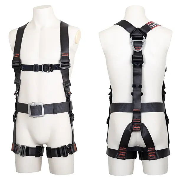 見た目も動きもスタイリッシュな、束縛感のない水平型腿ベルト採用モデル、黒影ハーネスのツインランヤード!