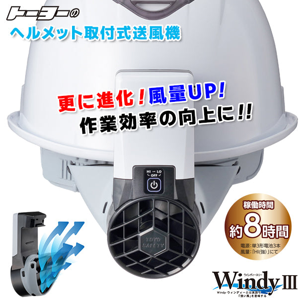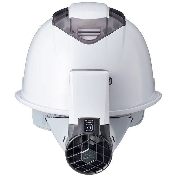 【おすすめポイント】さらに進化!風量UP!作業効率の向上に‼※風量は従来品の約10.8倍!※ヘルメットは別売りとなります。【送風機本体】■ご使用のヘルメットに取付が可能です。4種類のヘルメット取付部品を標準装備。■ルーバー構造の送風口が、後頭部から帽体内部まで風を送り込みます。■2段階切替えスイッチで風量の調整が可能になりました。「HI(強)」「LO(弱)」の切替えスイッチで風量設定が可能。■連続稼働時間は8時間です。「HI(強)」の場合、連続稼働時間は8時間です。経済面を考慮した場合充電式電池のご使用をお勧め致します。■安心の日本製・素材: 本体ケース・ケースカバー:ABS樹脂 ルーバー部材:ABS樹脂 排気ダクト:エラストマー樹脂 接続用ホルダー:ナイロン樹脂 ヘルメット取付部品:POM樹脂・風量 「HI(強)」:400L/min 「LO(弱)」:372L/min・連続稼働時間 「HI(強)」約8時間 「LO(弱)」約13時間・サイズ:幅120mm×高さ143mm×厚み60mm・重量:約190g(電池を含む)・電源:単3形電池3本(電池は付属しません)※注意事項※ファンモーターは5V対応品の為、それを超える電圧では使用しないでください。