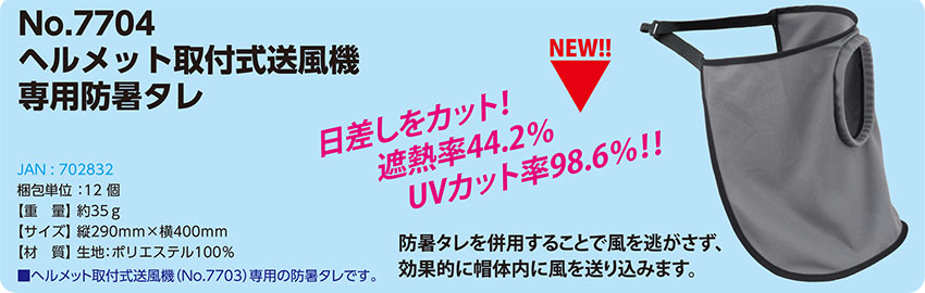 【おすすめポイント】日差しをカット!ヘルメット取付式送風機WindyⅢ用防暑タレ!遮熱率44.2%、UVカット率98.6%‼風を逃さず効果的に帽体内に送り込みます。※ヘルメットとヘルメット取付式送風機は別売りとなります。【防暑タレ】■防風タレの効果日差しをカット。遮熱率44.2%、UVカット率198.8%風を逃さず効果的に帽体内に送り込みます。■ヘルメット取付式送風機(7703)専用の防暑タレです。・重 量:約35g・サイズ:縦290mm×横400mm・材 質:生地ポリエステル100%