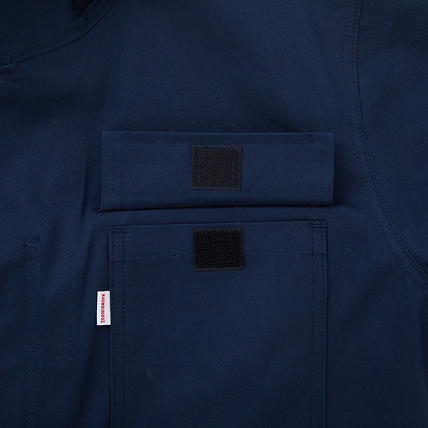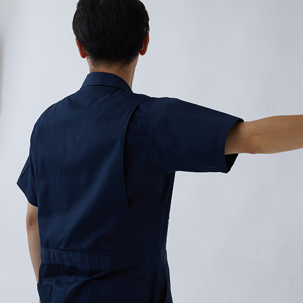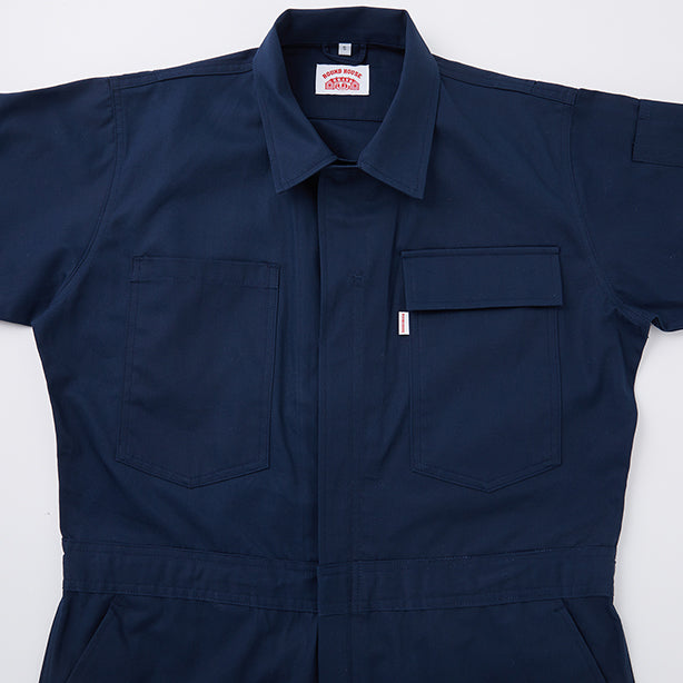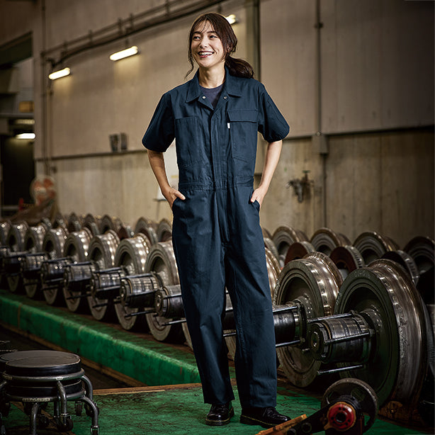 ハードな作業をもこなす丈夫さ、コットン100%の風合いが魅力のヘリンボン生地を採用。働くオトコはもちろん、カジュアルにそしてラフに着こなせばファッションとしても。ダンスウェアやチームユニフォームとしても好評の半袖カバーオールです。